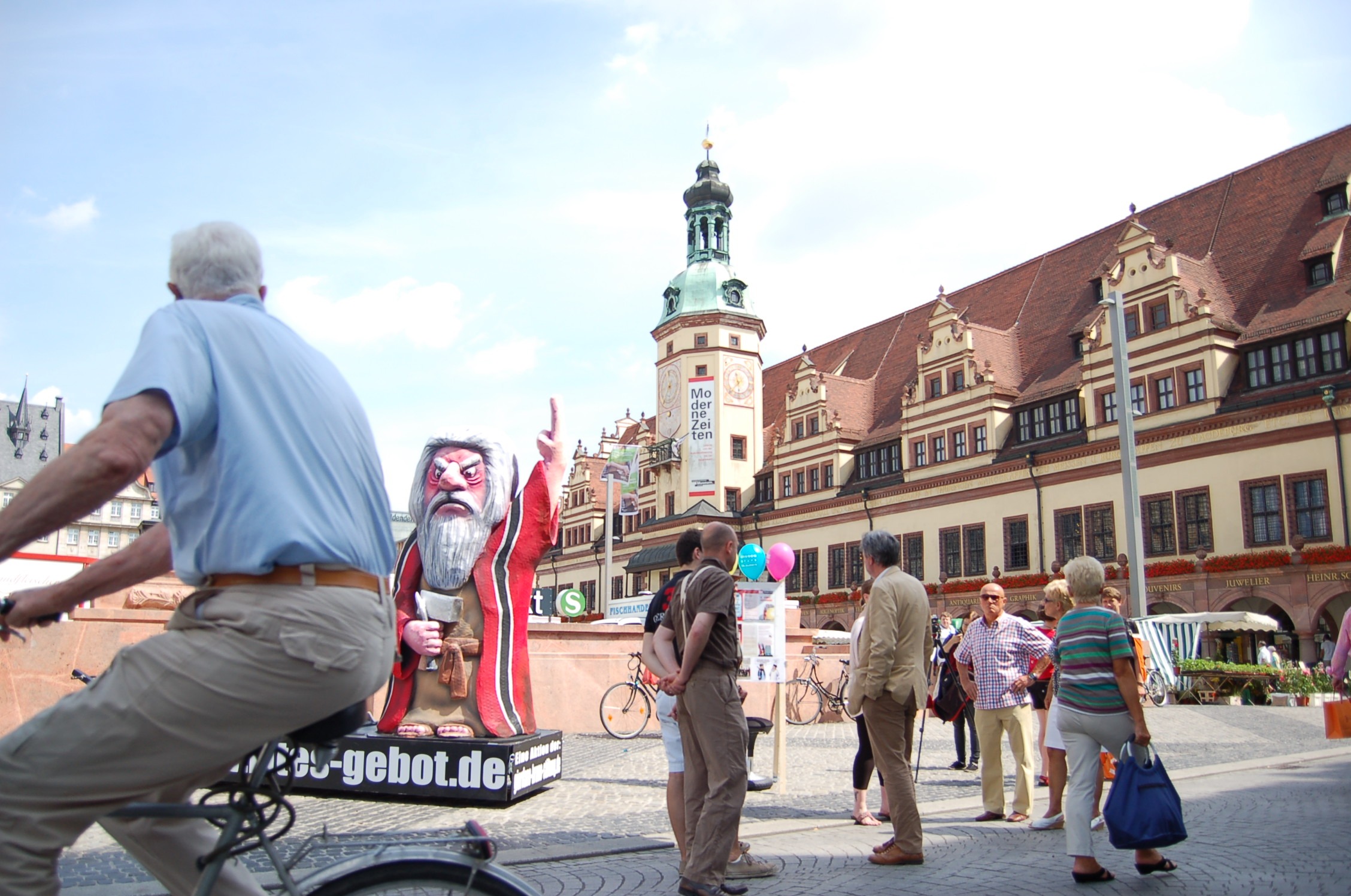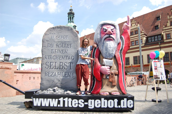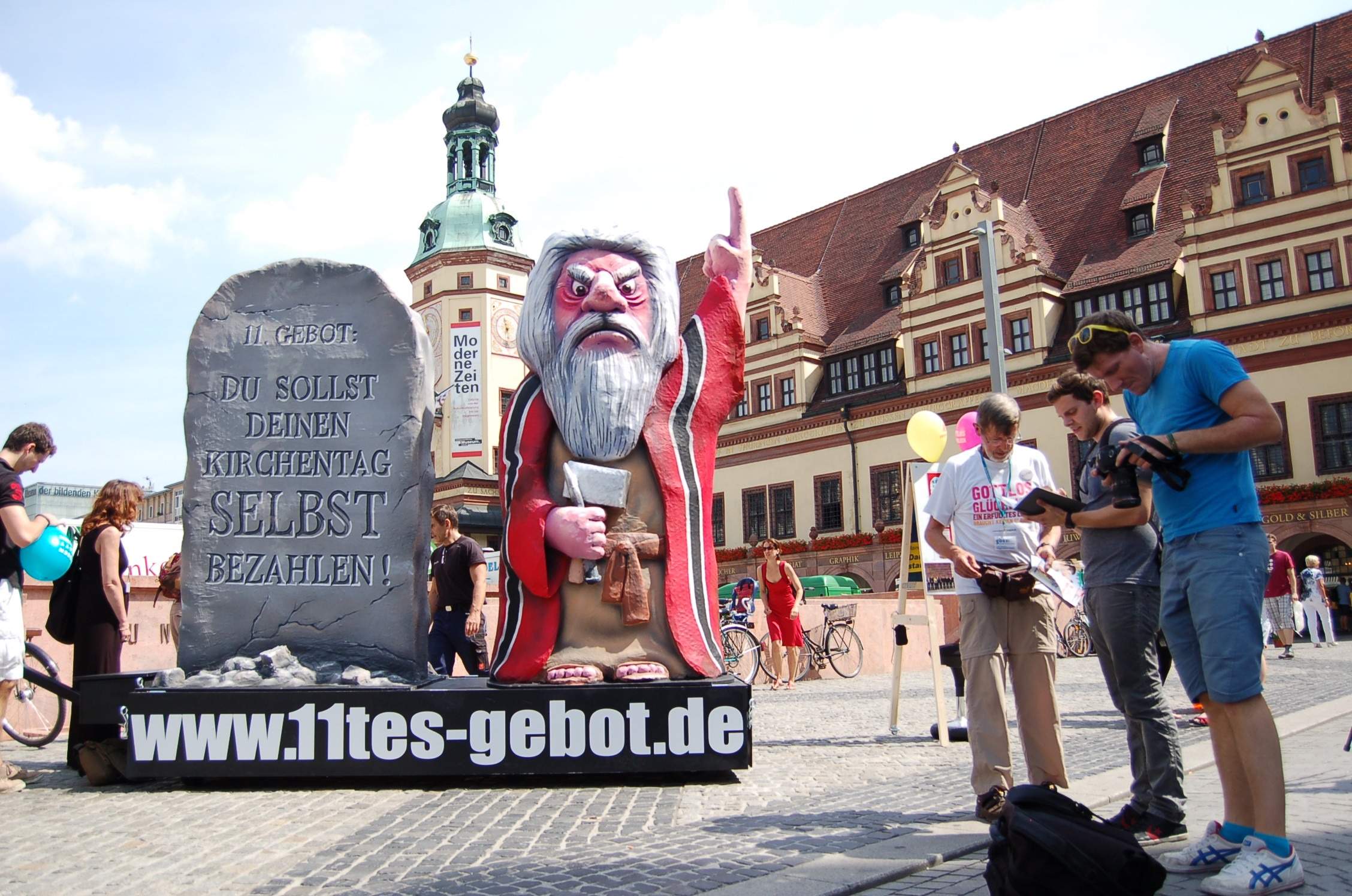 Der Leipziger Stadtrat hat in seiner Beratung vom 16. Juli 2014 die Entscheidung, ob die Stadt dem Katholikentag 2016 einen Zuschuss in Höhe von einer Million Euro gewähren soll, vertagt. Im Vorfeld der Stadtratssitzung gab es deutlichen Widerspruch vor aus der Fraktion der Piratenpartei, und die Grünen waren immerhin für eine Verringerung der Summe eingetreten. Auch die Regionalgruppen Mittelthüringen, Dresden und Stuttgart der humanistischen Giordano-Bruno-Stiftung und die gbs-Hochschulgruppe Jena protestierten gegen die im Raum stehenden Zahlungen und zogen die Mosesplastik mit dem „11. Gebot“ am 15. und 16. Juli durch die Leipziger Innenstadt.